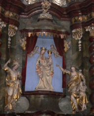 Chlum Svaté Máří, Sokolov, Czech RepublicOnce upon a time, on Chlum Hill in western Bohemia, a butcher's apprentice fell asleep under a hazel bush. On awaking, he found a statuette of the Virgin and child in the bush. He took it home, but the next morning it had disappeared. After a fruitless search, he returned to the hill and again found the statue in the branches. Deciding the Virgin wanted to stay there, he built a wooden shelter over the hazel bush. By the late 1200s, when the Virgin of Chlum had been forgotten, a barrel-maker's apprentice got lost near the spot. The Virgin appeared and asked him to repent of his sins. When he promised to do so, she showed him the statue and the way home. This time the community became more involved. They built a chapel on the hill to house the holy image, under the care of the Bohemian order of Knights of the Cross with the Red Star, which attracted many pilgrims. The town of Chlum Svaté Máří, Chlum St. Mary, grew up around it. Rebuilt after Protestant attacks in 1429 and 1618, the baroque church is still undergoing renovation following its closure and ruin during the Communist period. Pilgrimages have resumed. On May 8, the vicariate gathers at the shrine to honor the Mediatrix of Grace with a procession to a sacred spring, a lecture, confession, and mass. On Pentecost Sunday a religious pilgrimage is supplemented by a town fair with carnival rides and music. On a Sunday in mid-August, the shrine hosts its Assumption Pilgrimage and Egerland Day of Prayer, for both Czech and German speakers in this border region. After mass, pilgrims enjoy beer and brass band music. Sources:
